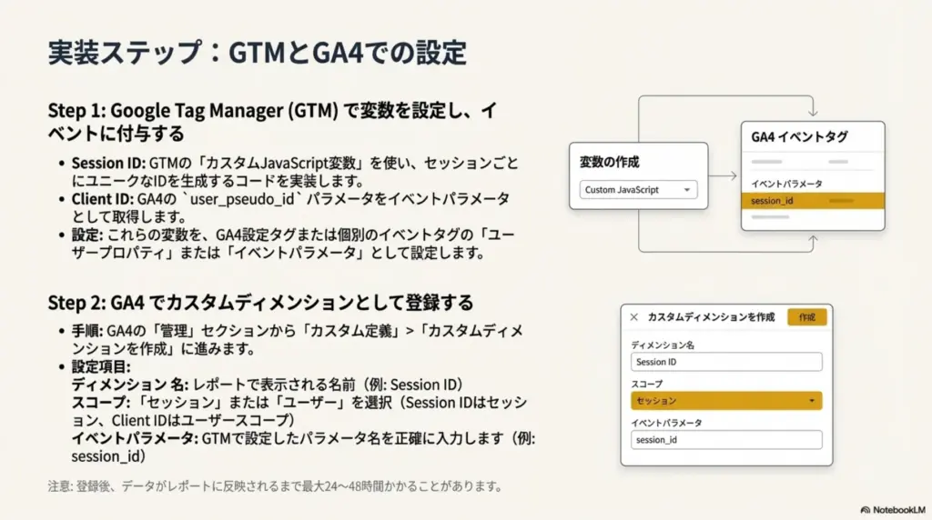 GA4を使い始めるには、正しい初期設定が不可欠です。ここでは、GTM (Google Tag Manager) を利用した推奨の導入手順と、後から変更できない重要な設定について解説します。